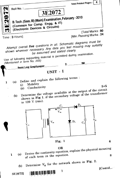 2010 Rajasthan Technical University B.Tech 3 Semester Computer science & engineering "Electronic Devices and Circuits" question paper