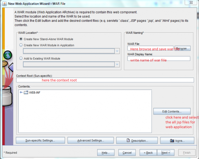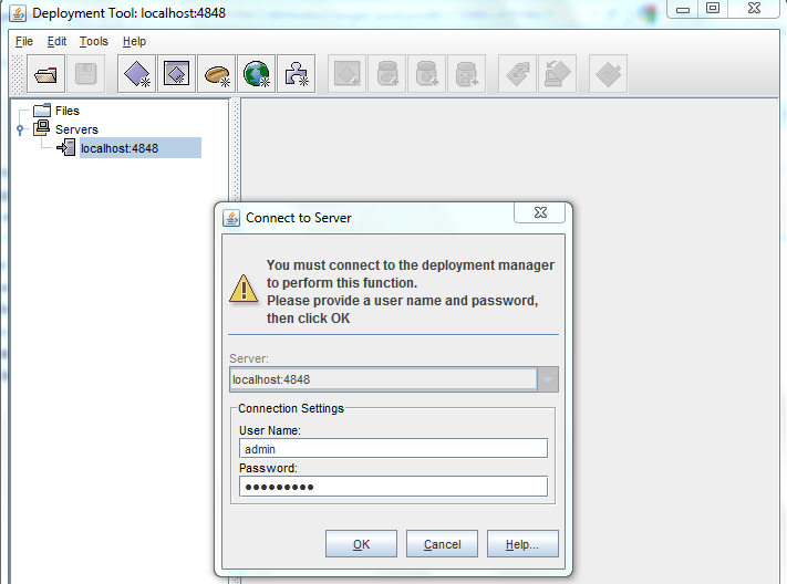 start the sun application server and open the Deployment tool. With the help of Deployment you can create the web application archive file and also deploy your jsp files to server which is run in your local-host. After open deployment tool Connect to server sub-window is opened in this enter user name and password which is same as the when the sun server is installed.